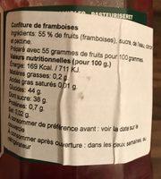 Ingredients: Ingrédients: 55 % de fruits (framboises), sucre, de l’eau, citron et pectine. Préparé avec 55 grammes de fruits pour 100 grammes.