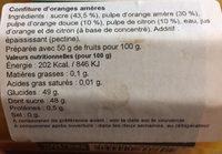 Ingredients: sucre (43,5 %), pulpe d'orange amère (30 0%), pulpe d'orange douce (10 %), pulpe de citron (10 0%), eau, Sus d'orange et de citron (à base de concentré). Additif épaississant (pectine). Préparée avec 50 g de fruits pour 100 g. Valeurs nutritionnelles (pour 100 g) Énergie : 202 Kcal. / 846 KJ Matières grasses : 0,1 g. Acides gras saturés : 0,01 g. Glucides : 49 g. Dont sucre 48 g. Protéines s. 0,5 g. Sel e. O g. consommer de préférence avant : voir la date sur le couvercle consommer après ouverture : dans les deux semaines, au réfrigérateur