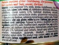 Ingredients: Pork 55%, water, modified starch, vegetable fiber, soy proteins, milk proteins, salt, stabilisers: diphosphates, triphosphates, polyphosphates, dried garlic 0,1%, hydrolysed yeast extracts, natural spice extracts,flavour enhancer: monosoduim glutamate, disodium 5'-ribonucleotides, preservative: sodium nitrite