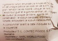Ingredients: Raifort réhydraté (48% min.), eau, vinaigre de vin, huile de tournesol, sel iodé, sucre, amidon modifié, acide citrique, gomme guar, gomme xanthane, colorant (dioxyde de titane), agent de conservation (sodium benzoate, potassium sorbate), antioxydant (sodium metabisulfite)