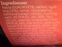 Ingredients: Pasta (durumvete, vatten), kyckling 12%, tomat, romanabönor, köttfond (vatten, nötkött, kyckling, salt), vetemjöl, lök, ägg, rött / vitt vin, paprika, mozzarella 1,5% (mjölk, salt, startkultur, ystenzym), bacon 1,3% (griskött, vatten, salt, antioxidationsmedel E331, konserveringsmedel E250, rökarom), oliv/rapsolja, tomatpuré, salt, vitlök, smör, soltorkade tomater (tomat, salt, vitlök, örter), modifierad vetestärkelse, _sojasås (vatten, sojabönor, vete, salt), basilika, persilja, farinsocker, socker, kryddor, citronskal, färgämne (sockerkulör).