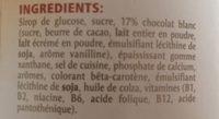 Ingredients: Sirop de glucose, sucre, 17, chocolat blanc (sucre, beurre de cacao, lait entier en poudre, lait écrérné en poudre, émulsifiant lécithine de soja, aròtne vanilline), épaississant gomme xanthane, sel de cuisine, phosphate de calcium, arÔfi1cs, colorant bêta-carotene, émulsifiant lécithine de soja, huile de colza, vitamines (BI, 02, niacine, B6, acide folique, BI 2, acide