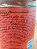Ingredients: Ovomaltine 33%. [Extrait de malt d'orge (51%), lait écrémé concentré, lactosérum concentré (lait), cacao maigre (13%), sucre, fructose, carbonate de magnésium, phosphate de calcium, huile de colza, vitamines (C, niacine: PP, E, acide pantothénique : B5, riboflavine : B2, B6, thiamine : B1, A, acide folique : B9, biotine: B8, B12), sel, arôme : vanilline], sucre, huiles végétales (colza et palme), noisettes, phosphate de calcium, émulsifiant : lécithine de tournesol, cacao maigre (0,4%), antioxydants : palmitate d'ascorbyle et alpha-tocophérol, arôme : vanilline
