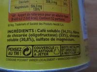 Ingredients: Café soluble (34,3 %), fibres de chicorée (oligofructose) (33 %), chicorée soluble (30,8 %), sulfate de magnésium.