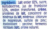 Ingredients: Lait entier 82%, sucre, maltodextrine, jus de framboise 3,5%, amidon transformé, crème, protéines de lait, concentré de minéraux du lait, minéraux : chlorure de magnésium, sulfate de zinc, épaississant : pectine, ferments lactiques (lait), arôme naturel.