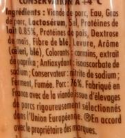 Ingredients: Viande de porc, eau, gras de porc, lactosérum, sel, protéines de lait 0.85%, protéines de pois, dextrose de maïs, fibre de blé, levure, arôme (céleri, blé), colorants : carmin, extrait de paprika, antioxydant : isoascorbate de sodium, conservateur : nitrite de sodium, ferment, fumée
