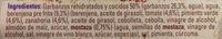 Ingredients: Garbanzos rehidratados y cocidos 50% (garbanzos 26,3%, agua), agua, berenjena prefrita (9,3%) (berenjena, aceite de girasol), tomate (4,6%), pimiento verde (4,6%), zanahoria (4,6%), aceite de girasol, cebolleta, cebolla, vinagre de alcohol, almidón de maíz, azúcar, mostaza (0,75%) (agua, semillas de mostaza, vinagre de alcohol, sal, vinagre de vino blanco, azúcar, especias), sal, pimienta, cúrcuma.