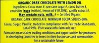 Ingredients: Cocoa Mass #,Raw Cane Sugar # ,Cocoa Butter # ,Emulsifier (SOYA Lecithin) ,Lemon Oil # (0.20%) ,Vanilla Extract