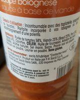 Ingredients: Purée de tomates 58%, Viande 25% (Boeuf 20% Porc 5%) oignon 4% Sel marin, Sucre, Poivre noir en poudre, carottes, CELERI, Huile de tournesol, Amidon de maïs modifié Laurier en poudre. Sans gluten
