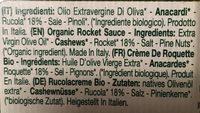 Ingredients: Extra Virgin Olive Oil* Cashews* - Rocket* 18% - Salt - Pine Nuts*. (Organic ingredient). Made ln Italy. (FR) Crème De Roquette Bio - Ingrédients: Huile D'olive Vierge Extra* - Anacardes* - Roquette* 18% - Sel - Pignons*. (*lngrédient biologique). Produit En Italie. (DE) Rucolacreme Bio - Zutaten: natives Olivenôl extra* - Cashewnüsse* - Rucola* 18% - Salz - Pinienkerne*. (*biologische Zutat). Heigestellt ln Italien.