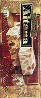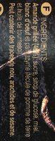 Ingredients: Amande grillée (46%) sucre, sirop de glucose, miel, blanc d’oeuf et pain azyme (fécule de pomme de terre et huile de tournesol). Peut contenir des trace de noix, arachides et de sésame.