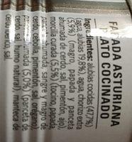 Ingredients: ADA ASTURIANA ATO COCINADO Ingtedientes: a!ubias cocidas (47,7%) (agca, alubias 19,8%), agua, chorizo extra (5,9%) (magro papada y panceta ahumada de cerdo, sel, pimentént aio), morci(la curada (tocinot papadat -w-kurnada, sangre y matro de cerdo, cebollat pimentdn, saj4 orégano)t (510î'6) de cerdmsal, humo natutal), manteca de