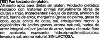 Ingredients: Fécula de patata, almidón de maíz, harina de arroz, margarina (grasa de palma, grasa de coco, agua, aceite de colza, sal, emulgentes: mono- y diglicéridos de ácidos grasos (E-471), aroma natural), harina de arroz integral, azúcar, jarabe de arroz, harina de maiz, fibra de achicoria, espesante: hidroxipropilmetilcelulosa (E-464), levadura, sal, aroma natural.