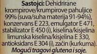 Ingredients: Dehidrirane krompirove pahuljice 99% (suva materija 91-94%), konzervans E223, emulgator E471, stabilizator E450i, kiselina: limunska kiselina E330, antioksidans E304i, začin (kurkuma).