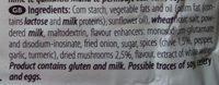 Ingredients: Kukuruzni skrob, biljne masti i ulje (palmina mast (sadrži laktozu i mlečne proteine), suncokretovo ulje), pšenično brašno, so, mleko u prahu, maltodekstrin, pojačivači arome: mononatrijum-glutaminat i dinatrijum-inozinat, prženi crni luk, šećer, začini (vlašac 1.5%, paprika, beli luk, kurkuma), sušeni vrganj 2.5%, aroma, ekstrakt belog vina.