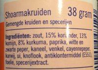 Ingredients: zout, koriander 15%, komijn 13%, kurkuma 8%, paprika, witte en zwarte peper, kaneel, venkel, cayennepeper, karwij, ui, knoflook, antiklontermiddel (E551), foelie, specerijextract