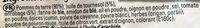 Ingredients: Pommes de terre (90 %), huile de tournesol (5 %). enrobage (5 %) : farine de blé, amidon de blé, ail en poudre, oignon en poudre, sel, tomate en poudre, épices (cumin, poivre de cayenne, poivre blanc), herbes (origan, persil), poudre de poivron rouge, huile de citron vert, extrait d'oignon, colorant (E160c).