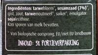 Ingredients: Organische _tarwe_bloem, organische sesamzaad 7%, gist, zout, organische _tarwe_moutmeel, organische suiker, emulgator (_soja_lecithine)