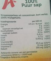 Ingredients: 100% Puur sap naasappelsap uit concentraat, kort verhit. 100% fruitgehalte. Voedingswaarde Energie Vet per 100 ml 171 kJ / 41 kcal (2%*) waarvan verzadigd vet Koolhydraten (3%*) (10%*) 8,6 g 8,6 g 0,41g 0,7 g 0,002 g waarvan suikers Vezels Eiwit Zout Vitamine B11 (Foliumzuur) Vitamine C Kalium (1%*) (<1%*) 25,0 g (13%**) 33 mg (41%**) 200 mg (10%**) Referentie-inname van een gemiddelde Dagelijkse Referentie Inname. volwassene (8400 kJ /2000 kcal).
