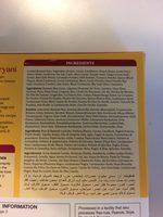 Ingredients: Basmati Bien Cuire, Légumes (Pommes De Terre, Carottes, Chou-Fleur, Haricots Verts, Petits Pois), L'oignon, Eau, L'huile De Tournesol, Sel, Ail, Feuilles De Menthe, De Pâte De Tomate, Gingembre, Le Piment Vert, Cumin, Piment Rouge Entier, La Coriandre En Poudre, Piment En Poudre, Poudre De Curcuma, Épices (Poivre Noir, Cardamome Noire, Cardamome Verte, Mace, Cumin En Poudre, Poudre De Clou De Girofle, Laurier, Cannelle En Poudre), Anis Étoilé, La Cardamome Noire, Clou De Girofle, Cannelle. Zutaten: Gekochten Basmati Reis, Gemüse (Kartoffel, Karotte, Blumenkohl, Franzôsische Bohnen, Grüne Erbsen), Zwiebel, Wasser, Sonnenblumenôl, Salz, Knoblauch, Minze-Blatter, Tomatenpaste, Ingwer, Grün Chilli, Kreuzkümmel, Rote Chilli Ganzes, Korianderpulver, Chilli Pulver, Gelbwurz Pulver, Gewürze (Schwarzer Pfeffer, Schwarzen Kardamom, Grün Kardamom, Muskatblüte, Kreuzkümmelpulver, Gewürznelkenpulver, Lorbeerblatt, Zimtpulver), Stern Anis, Schwarzer Kardamom, Lorbeerblatt, Gewürznelke, Zimt. Ingredienti: Riso di Basmati cucinato, Verdura (Patata, Carota, Cavolfiore, Fagioli francesi, Piselli Verdi), Cipolla, Acqua, Olio di Girasole, Sale, Aglio, Foglie di menta, Concentrato di pomodoro, Zenzero, Peperoncino verde, Cumino, Peperoncino Rossi Intero, Polvere di Coriandolo, Polvere di peperoncino, Polvere di Curcuma, Spezie (Pepe Nero, Cardamomo Nero, Cardamomo Verde, Macis, Polvere di Cumino, Polvere di Spicchio, Foglia di baia, Polvere di Cannella), Anice stellato, Cardamomo Nero, Foglia di Baia, Spicchio, Cannella. Ingredientes: Arroz Basmati Cocido, Verduras (Patata, Zanahoria, Coliflor, Judias Verdes, Guisantes), Cebolla, Agua, Aceite De Girasol, Sal, Ajo, Hojas De Menta, Pasta De Tomate, Jengibre, Aji Verde, Comino, Ajo Rojo Entero, Cilantro En Polvo, Aji En Polvo, Cürcuma en Polvo, Especias (Pimienta Negra, Cardamomo Negro, Cardamomo Verde, Nuez Moscada, Comino En Polvo, De Clavo en Polvo, Laurel, Canela En Polvo), Anis Estrellado, Cardamomo Negro, Hoja De Laurel, Clavo De Olor, Canela.