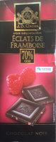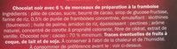 Ingredients: Pâte de cacao, sucre, beurre de cacao, sirop de glucose-fructose, farine de riz, purée de framboises concentrée 0.5%, émulsifiant (lécithine (tournesol)), huile de palme, amidon de riz, épaississant : pectine, arôme naturel, concentré de carotte à propriété colorante, fibre de cedrat, extrait de vanille.