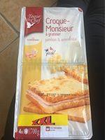 Ingredients: 40,8 % Pain de mie (farine de blé, huile de colza, sel, dextrose, levure, conservateur : propionate de calcium, émulsifiants : mono - et diglycérides d'acides gras, lécithines, gluten de blé, épaississants : gomme xanthane, agent de traitement de la farine : acide ascorbique), 31,2 % sauce Mornay (lait entier, Emmental (lait), farine de blé, beurre (lait), sels, poivre, muscade), 17 % jambon cuit standard (11,2 % jambon de porc, eau, sel, sirop de glucose, stabilisants : triphosphates, diphosphates, dextrose, arômes, gélifiant : carraghénanes, antioxydant : érythorbate de sodium, conservateur : nitrite de sodium), 11 % Emmental (lait).