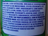 Ingredients: SÜSSUNGSMITTEL XYLIT, ALUMASSE, SUSSUNGSMITTEL SORBIT, VERDICKUNGSMITTEL GUMMI ARABICUM, maHTHALITEMITTEL GLYCERIN, AROMEN, FÜLLSTOFF CALCIUMPHOSPHATE, TOR SOJALECITHIN, SÜSSUNGSMITTEL ASPARTAM, MANNIT, ACESULFAMIC FARESTOFF E27, OBERZUGSMITTEL CARNAUBAWACHS, ANTIOXIDATIONSMITTEL BHA FARESTOFF E13. ENTHÄLT EINE PHENYLALANINQUELLE. KANN BEI ÜBERMASSIGEM ENZEHR ABFÜHREND WIRKEN. NACH DEM ESSEN/TRINKEN MIND. 20 MINUTEN KAUEN HWECHSLUNGSREICHE, AUSGEWOGENE ERNÄHRUNG UND GESUNDE LEBENSWEISE SMO WICHTIG ZUCKERFREIER KAUGUMMI UNTERSTÜTZT DIE NEUTRALISIERUNG DER PLALVESAUREN, DIE EIN RISIKOFAKTOR BEI DER ENTSTEHUNG VON ZAHNKARIES SIND UANWARIES KANN UNTERSCHIEDLICHE RISIKOFAKTOREN HABEN. UHUND TROCKEN AUFBEWAHREN.