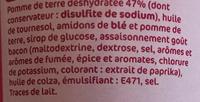 Ingredients: Pomme de terre déshydratée 40 %, huile de tournesol, amidon de pomme de terre, amidon modifié de pomme de terre, farine de riz, sucre, sel, arôme (dont arôme de fumée), émulsifiant : E471, paprika, maltodextrine, viande porcine en poudre 0,05 %, oignon en poudre, colorant : extrait de paprika, extrait de levure.
