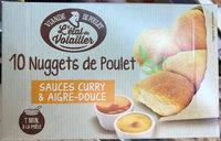 Ingredients: Nuggets (51% viande de poulet reconstituée, farine de blé, farine de maïs, semoule de blé, eau, huile de tournesol, amidon de maïs, sel, huile de colza, amidons modifiés (maïs, blé, pomme de terre), gluten de blé, amidon de blé, poudres à lever : diphosphates, carbonates de sodium, posphates de calcium, épices (dont céleri), extrait d'épices, dextrose), sauce aigre-douce (eau, sucre, abricots, sirop de glucose, vinaigre d'alcool, fructose, amidon modifié de maïs, sel, épices (dont céleri), huile de colza, épaississant : gomme xanthane, sirop de sucre caramélisé, arôme naturel, acidifiant : acide citrique), sauce curry (sucre, eau, purée de pommes, vinaigre d'alcool, triple concentré de tomate, épices, curry, amidon modifié de maïs, sel, épaississant : gomme xanthane, dextrose, extrait d'épices).