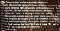 Ingredients: 30% Schokoladenüberzug [Zucker, Kakaomasse, Kakaobutter, Butterreinfett, Emulgator: Lecithine (Sonnenblume], Glukosesirup, gezuckerte Kondensmagermilch (Zucker, Magermilch), Zucker, Palmfett, fettarmer Kakao, Feuchthaltemittel: Sorbit; 1,8% Schokolade [Zucker, Kakaomasse, Kakaobutter, Butterreinfett, Emulgator: Lecithine (Sonnenblume)], Süßmolkenpulver, Emulgator: Lecithine (Sonnenblume); natürliches Aroma