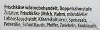 Ingredients: Frischkäse (Milch, Rahm, mikrobieller Labaustauschstoff, Käsereikulturen), Speisesalz, Petersilie, Schnittlauch, Pfeffer, Zwiebeln, Knoblauch.