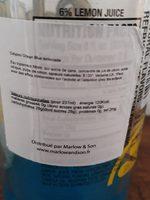 Ingredients: Filtered water cane and or beet sugar, lemon juice concentrate citric acid, lemon fruit pulp, natural flavors (brominated soybean oil,estea gum, gum arabic as cloud), fd&o blue edta to preserve color.