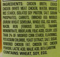 Ingredients: Chicken Broth, Cooked Chicken (White Meat Chicken, Water, Modified Rice Starch, Isolated Soy Protein, Salt, Sodium Phosphates), Carrots, Enriched Egg Noodles (Durum Wheat Semolina, Whole Egg, Egg White, Niacin, Iron [Ferrous Sulfate], Thiamine Mononitrate, Riboflavin, Folic Acid), Celery, Less Than 2% Of: Modified Corn Starch, Flavorings, Potassium Chloride, Yeast Extract, Salt, Sugar, Rendered Chicken Fat, Chicken Fat, Chicken Powder, Lactic Acid, Malic Acid, Beta Carotene.CONTAINS: WHEAT, SOY, EGG.