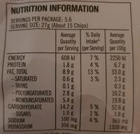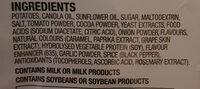 Ingredients: POTATOES, CANOLA OIL, SUNFLOWER OIL, SUGAR, MALTODEXTRIN, SALT,TOMATO POWDER, COCOA POWDER, YEAST EXTRACTS, FOOD ACIDS (SODIUM DIACETATE, CITRIC ACID), ONION POWDER, FLAVOURS, NATURAL COLOURS (CARAMEL, PAPRIKA EXTRACT, GRAPE SKIN EXTRACT), HYDROLYSED VEGETABLE PROTEIN (SOY), FLAVOUR ENHANCER (635), GARLIC POWDER, SPICE (BLACK PEPPER), ANTIOXIDANTS (TOCOPHEROLS, ASCORBIC ACID, ROSEMARY EXTRACT). CONTAINS MILK OR MILK PRODUCTS CONTAINS SOYBEANS OR SOYBEAN PRODUCTS