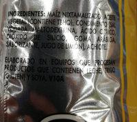 Ingredients: INGREDIENTES: MAIZ NIXTAMALIZADO ACEITE VEGEIALCONTIENE TBHO), CONDIMENTO (SAL YODADA, MALTODEXTRINA, ACIDO CITRICO DIOXIDO DE SILICIO, GOMA ARABIGA $ABORIZANTE, JUGO DE LIMONI, ACHIOTE ELABORADO EN EQUIPOS QUE PROCESAN PRODUCTOS QUE CONTIENEN LECHE, TRIGO GLUTENI Y SOYA. V10A