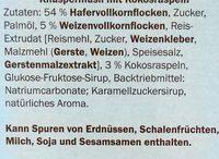 Ingredients: 54% Hafervollkornflocken, Zucker, Palmöl, 5% Weizenvollkornflocken, Reis-Extrudat [Reismehl, Zucker, Weizenkleber, Malzmehl (Gerste, Weizen), Speisesalz, Gerstenmalzextrakt], 3% Kokosraspeln, Glukose-Fruktose-Sirup, Backtriebmittel: Natriumcarbonate; Karamellzuckersirup, natürliches Aroma.