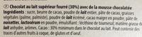 Ingredients: Sucre, beurre de cacao, poudre de lait entier, pâte de cacao, matière grasse végétale (palme, palmiste), poudre de lait écrémé, cacao maigre en poudre, pâte de noisettes, lactose et protéines de lait, émulsifiant : lécithine de tournesol, matière grasse de lait anhydre, arômes.