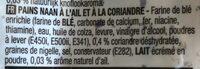 Ingredients: Farine de blé enrichie (farine de BLÉ, carbonate de calcium, fer, niacine, thiamine), eau, huile de colza, levure, vinaigre d'alcool, poudres à lever (E450i, E500i, E341), 0,4 % coriandre déshydratée, graines de nigelle, sei, conservateur (E282), LAIT écrémé en poudre, 0,03 % arôme naturel d'ail.